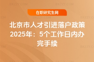 根據(jù)北京市人才引進(jìn)落戶政策2025年要求,符合條件引進(jìn)人才可快速辦理引進(jìn)手續(xù),最快5個(gè)工作日辦理完成引進(jìn)手續(xù)!