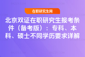 北京雙證在職研究生報考條件按學(xué)歷分層設(shè)定,專科需畢業(yè)滿5年,部分專業(yè)受限且復(fù)試可能加試;本科需畢業(yè)滿3年,有學(xué)士學(xué)位報考更靈活,無學(xué)位者需補(bǔ)充優(yōu)勢材料;碩士或博士畢業(yè)滿2年即可報考,復(fù)試有優(yōu)勢。管理類、工科類等特殊專業(yè)有額外從業(yè)經(jīng)驗(yàn)或資質(zhì)要求,部分院校還設(shè)戶籍、社保或推薦信要求。……